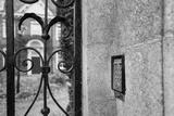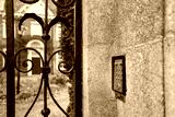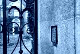 Shallow focus of a metal intercom system seen out a gated entrance to a distant large period house.