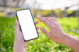 Close-up image of a woman using her smartphone in the greenhouse. Modern agricultural farm