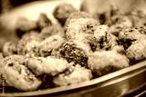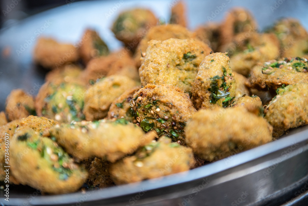 A close up detail of freshly cooked deep fried Falafel, a chickpea and herb filled snack popular in Egypt and all over the Middle East