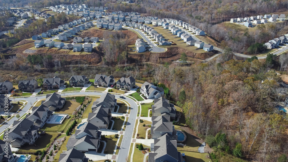 Row of new developments houses in master planned subdivision with lush green trees and natural trails outside Atlanta, Georgia, USA