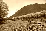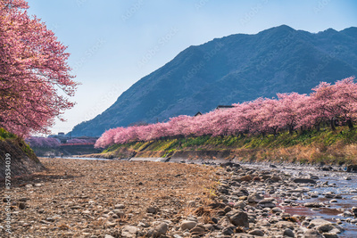 桜の名所 河津川の桜並木と天嶺山【静岡県・賀茂郡・河津町】 Kawazu cherry blossoms blooming along the Kawazu River, a famous place for cherry blossoms - Shizuoka, Japan