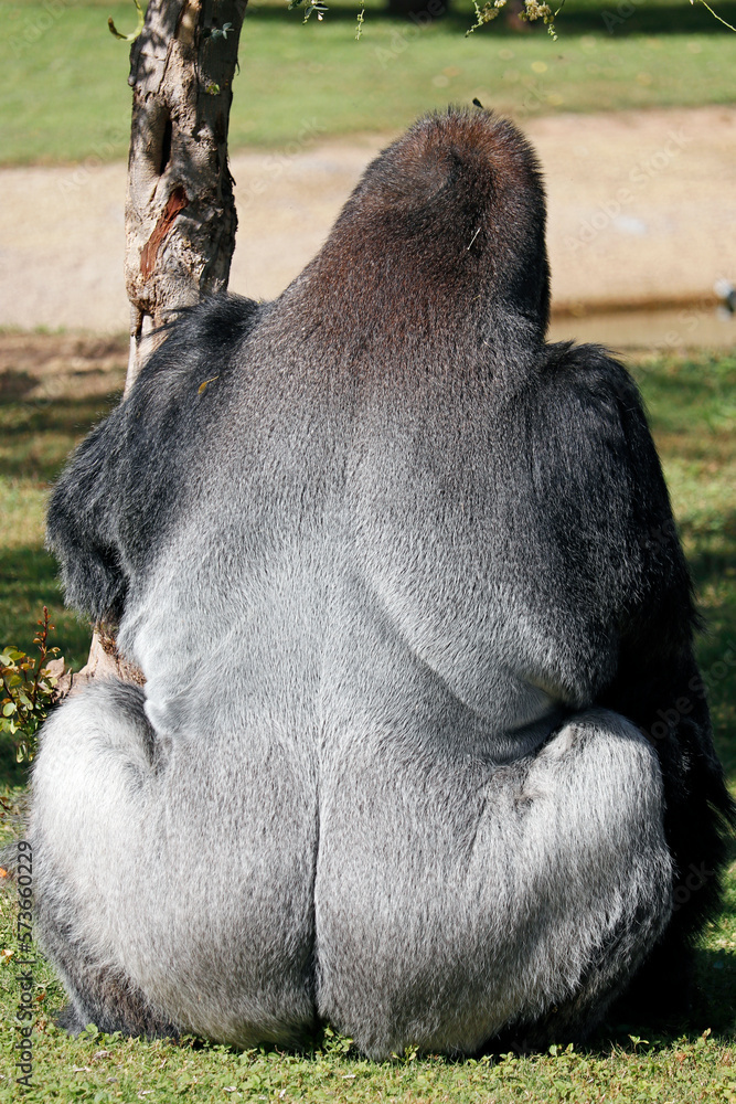 silverback gorilla male gets a portrait sitting on a sunny day from back side