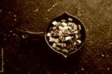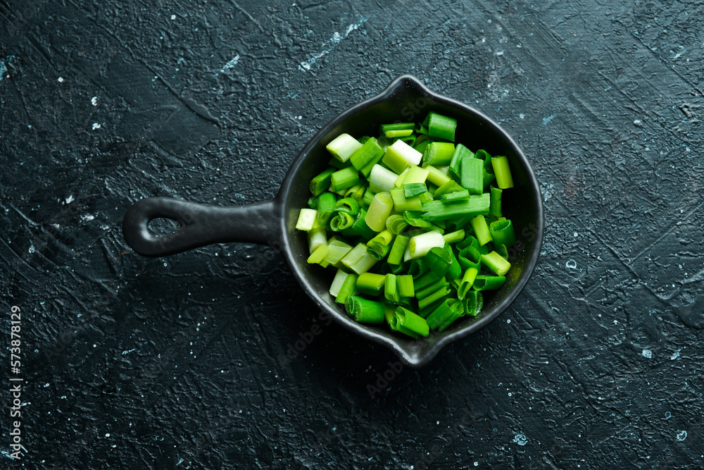 Green onion. Chopped green onion pods in a sauce pan. On a black stone background.