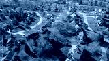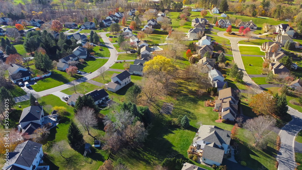 Aerial low-density residential living suburban neighborhood with cul-de-sac street, autumn leaves, grassy yards landscaping in Rochester, Upstate New York, USA