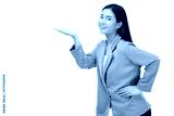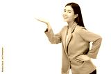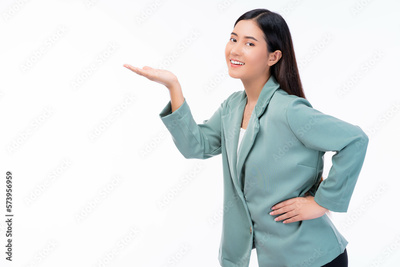 Young asian woman holding copy space imaginary on palm to insert ad Over isolated on white background Portrait happy smiling girl holding copyspace on beauty palm hand Business person look at camera