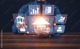 real estate investment concept, Real estate concept business, home insurance and real estate protection. Buy and sell houses and real estate online on a virtual screen.