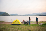 Landscape view of campground with camper people and camping tent with lake view and mountain at sunset.