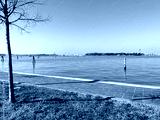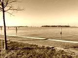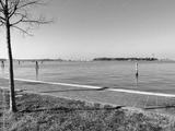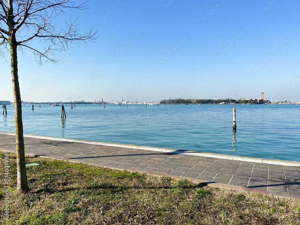 view of Venetian Lagoon from promenade of Lido di Venezia district of Venice city in February morning