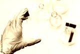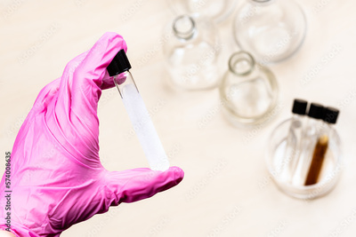 gloved hand holds closed test tube with white translucent liquid over light table with bottles