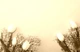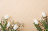White tulips and gypsophila flowers bouquet on a beige background. Mothers Day, birthday celebration concept. Copy space for text. Mockup