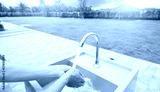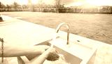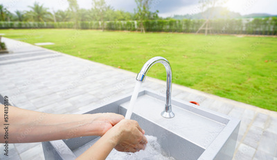World water day concept. Woman washing hands with tap water under faucet at white sink. Washing hands with tap water at outdoor sink near green grass lawn. Personal hygiene. Water consumption.