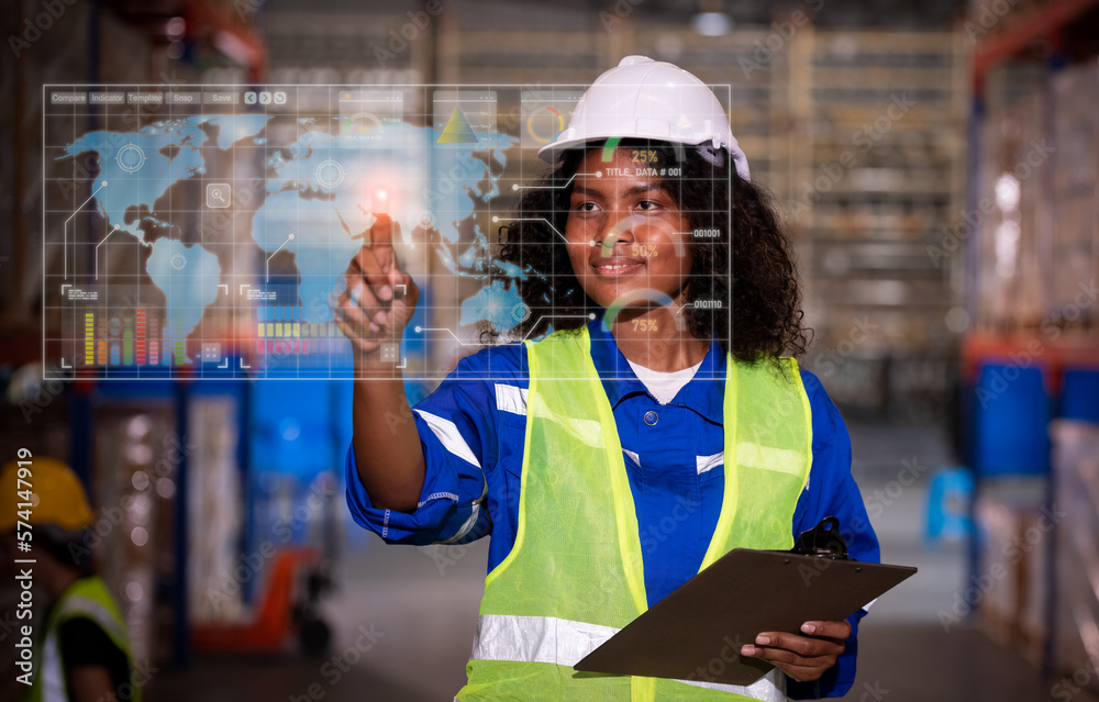 Double exposure worker warehouse industry holding document file point to info graphic show technology industry business import export worldwide is international industry business concept.