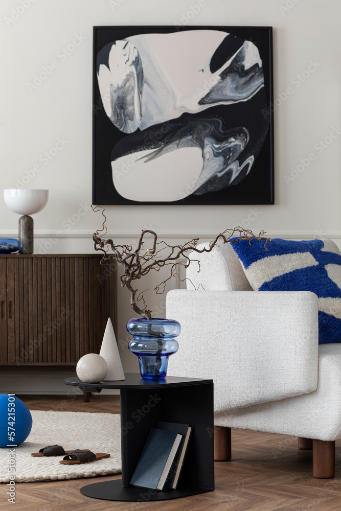 Aesthetics composition of living room interior with mock up poster frame, white armchair, vase with branch, black coffee table, geometric sculptures and personal accessories. Home decor. Template..