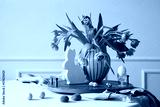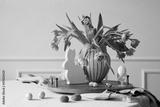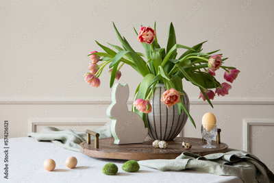 Interior design of easter dining room with colorful easter eggs, easter bunny sculptures, vase with tulips, wooden trace, beige wall with stucco, gray hen and personal accessories. Home decor Template