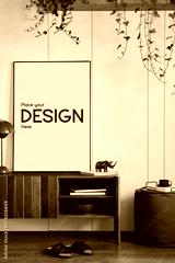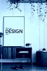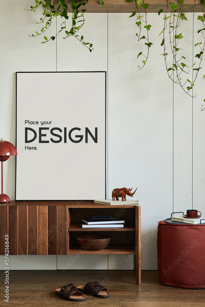 Stylish and creative living room interior design with wooden commode, structure painting, plants and personal decorations. Sunny and classy space, minimalistic style. Template.