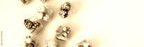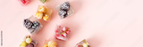 Frozen ice cubes with various fruits banner, blackberries and raspberries, gooseberries and currants, blueberries and mint, top view