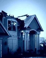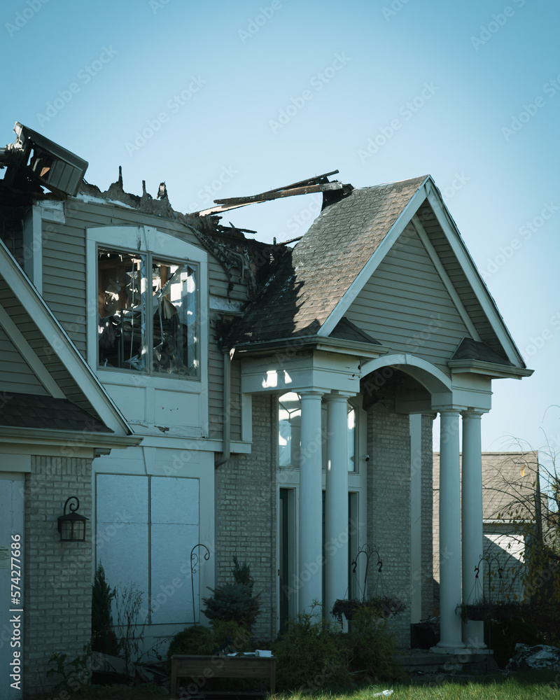 Toned photo ruined two story houses with shingle roof and front garage destroyed by fire in Rochester, Upstate New York, USA