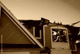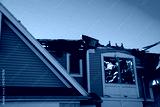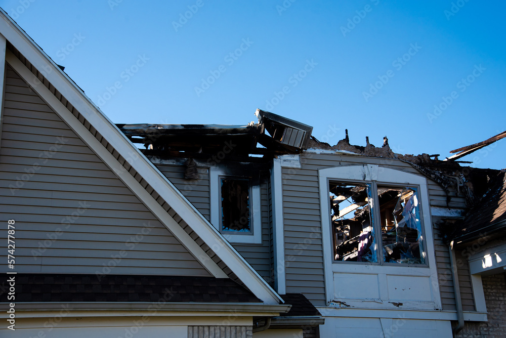 Broken windows on second floor and gable roof edges pitches of single-family home destroyed by fire in Rochester, New York, USA