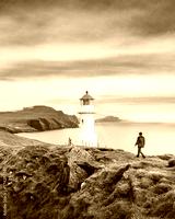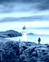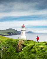 Foggy view of old lighthouse on the Mykines island, Faroe islands, Denmark. Landscape photography