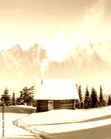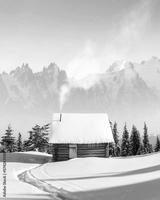 Fantastic winter landscape with wooden house in snowy mountains. Smoke comes from the chimney of snow covered hut. Christmas holiday concept