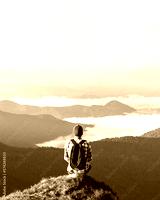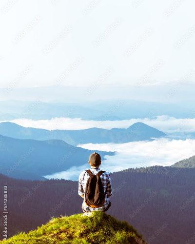 A tourist sits on the edge of a cliff covered with a pink carpet of rhododendron flowers in the summer. Foggy mountains on the background. Landscape photography