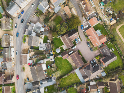 Aerial view of part of a typical English village, showing the main road snaking into the village High Street on the lower left.