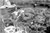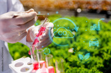 Close-up hand of farmer conducts research about lettuce for good agricultural quality inspection.agriculture, gardener, farm, harvest, vegetable, technology concept.