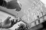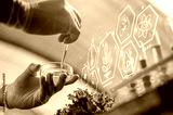Close-up hand of farmer conducts research about lettuce for good agricultural quality inspection.agriculture, gardener, farm, harvest, vegetable, technology concept.