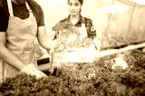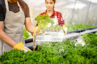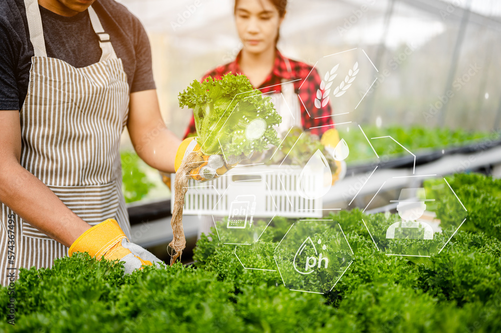 The gardener harvesting lettuce at vegetable growing house in morning.agriculture, gardener, farm, harvest, vegetable, technology concepts.