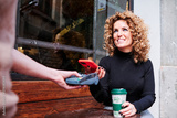 Woman smiling while making contactless payment with smartphone at coffee shop.