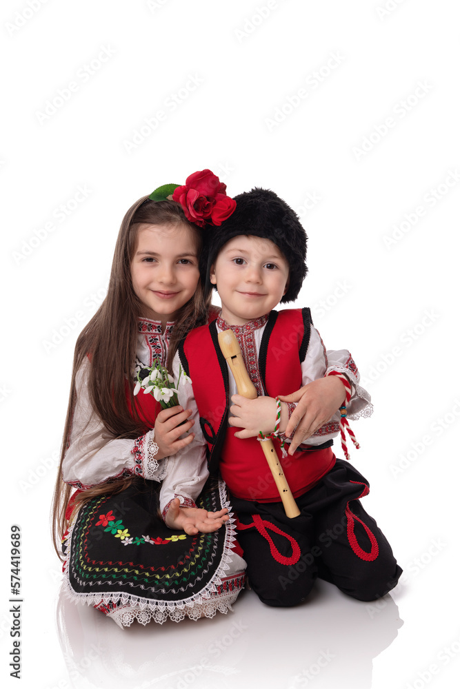 Bulgarian kids boy and girl in traditional folklore costumes with snowdrop flowers and handcraft wool bracelet martenitsa symbol of Baba Marta, spring and Easter, studio portrait