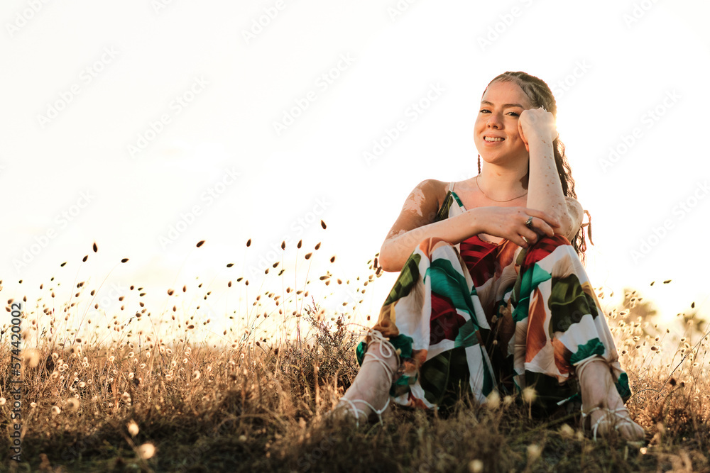 Woman with vitiligo looking at camera and smiling while relaxing outdoors in nature.
