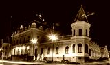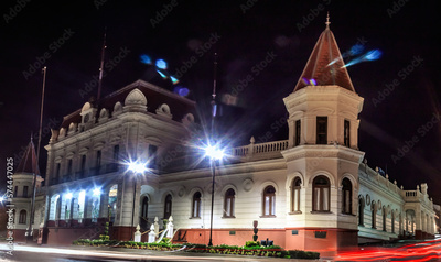 red and white building at night in downtown, building with british style of architecture, city hall of el oro de hidalgo state of mexico
