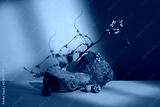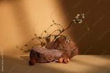 White flower with green leaves, brown stones and some walnuts on brown background for advertising cosmetics with walnut extract