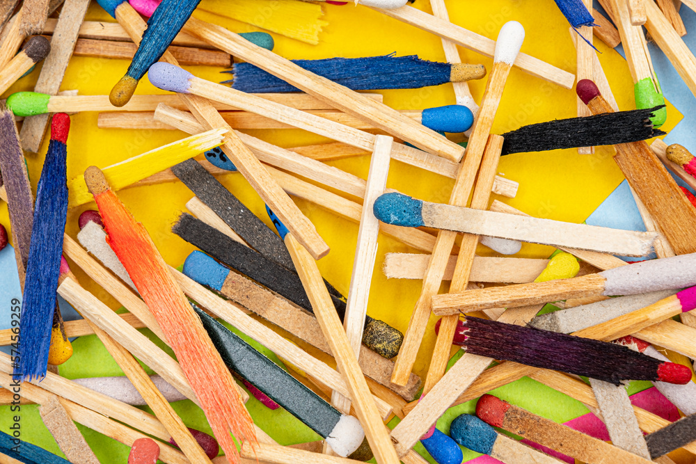 matchsticks of various shapes and colors with multicolored paper sticky notes on background