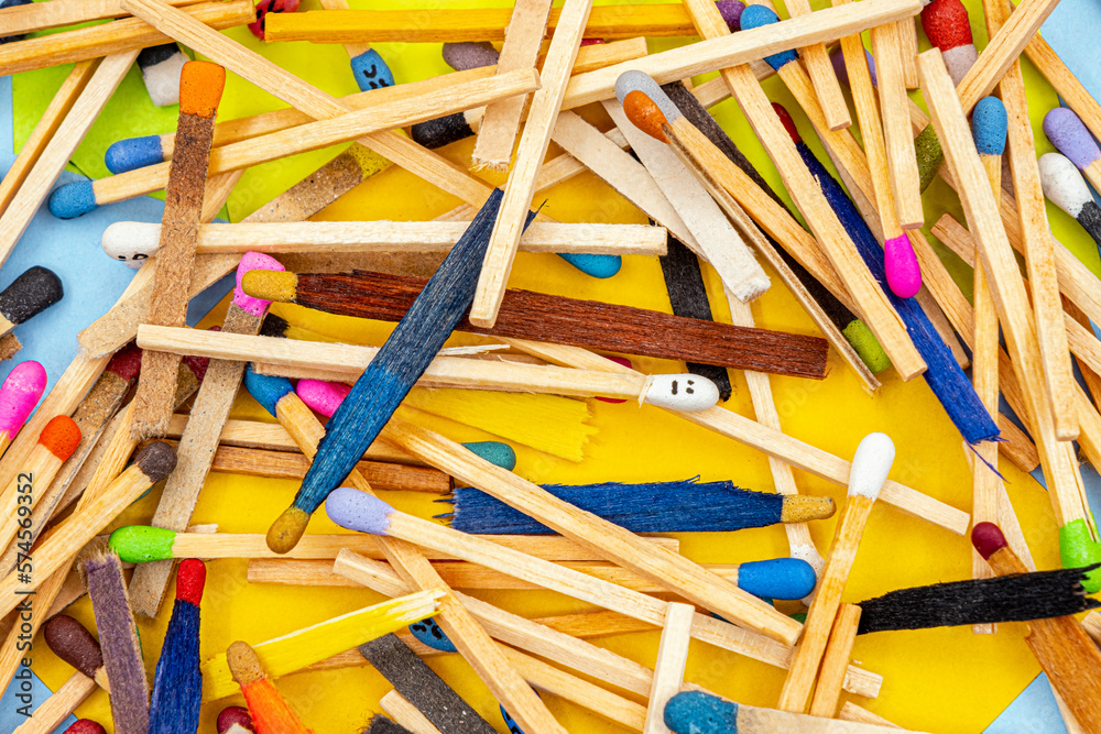 matchsticks of various shapes and colors with multicolored paper sticky notes on background