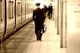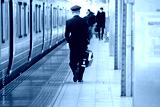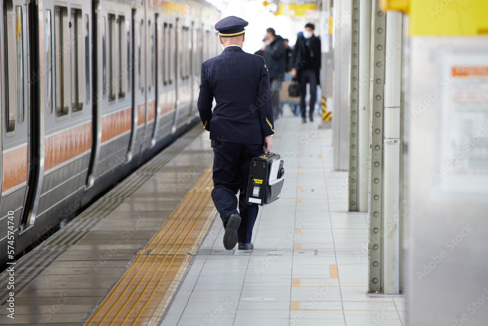 朝の名古屋駅のホームで歩く駅係員の後ろ姿