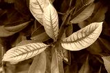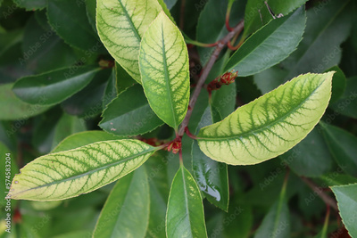 Close-up of iron chlorosis disease on Photinia hedge in the garden. Photinia x fraseri