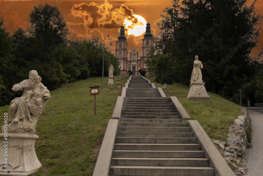 Georgian dumplings Khinkali on plate with red tomato sauce and fresh cilantro top view on rustic stone background, traditional dish of Georgia