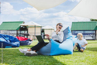 Mother with laptop, her son playing outdoors on green lawn. Rest and work with a child in the park