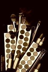 Bright eye shadow, blush brushes, explosion of multicolored powder dust on black background. Highly vibrant color-pressed pigment palettes for make-up. Abstract background for cosmetic concept.
