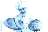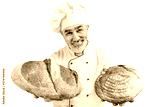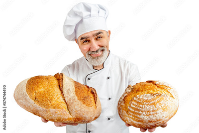 Professional baker offering freshly baked bread. Chef-cooker in a chef's hat and jacket. Senior baker man wearing a chef's outfit. Character kitchener, pastry chef for advertising