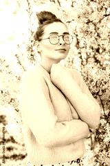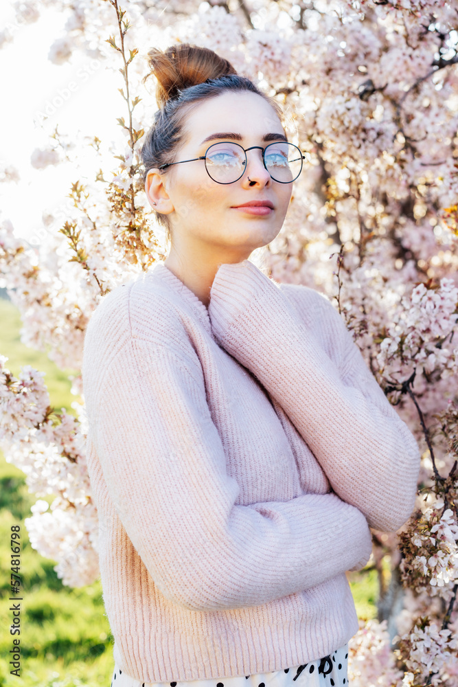 Portrait of young caucasian brunette hipster girl in glasses and light pink clothes near blooming tree with sunset light and sunbeams. Generation Z girl enjoy spring mood. Vertical card.