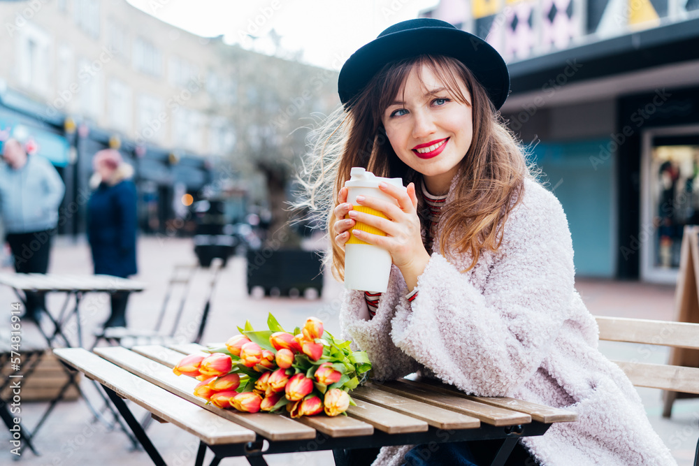Portrait of stylish young woman enjoying coffee from a reusable cup at the table of European street cafe, smiling and looking away. Fresh tulips bouquet on the table. Springtime street fashion.