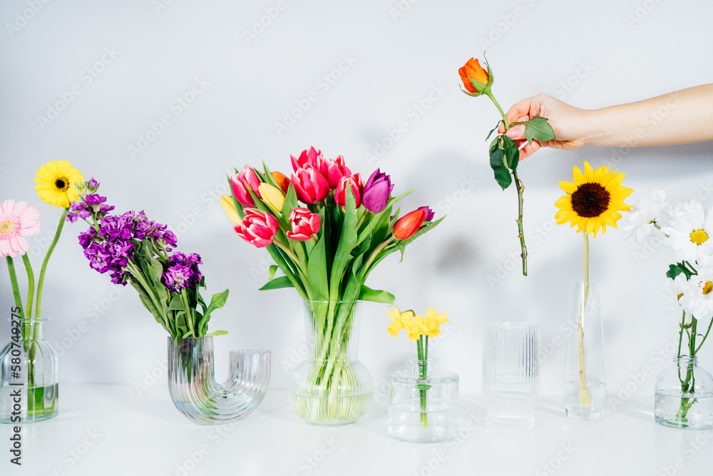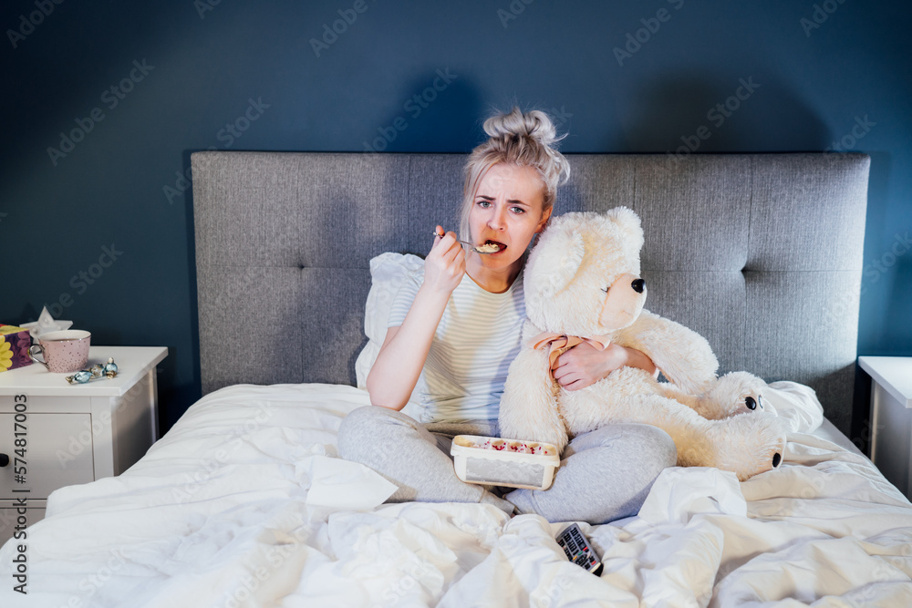 Heartbroken young woman huggying big teddy bear, eating ice cream from bucket while watching romantic movie on TV at home. Sad lady over breakup or relationship problems, feeling depressed and lonely.