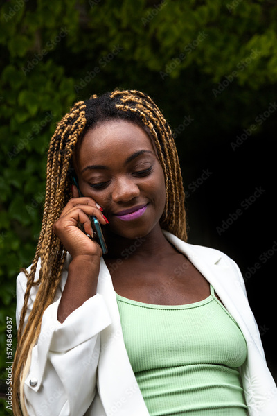 Happy Young Black woman talking on the phone outdoors.Vertical image.