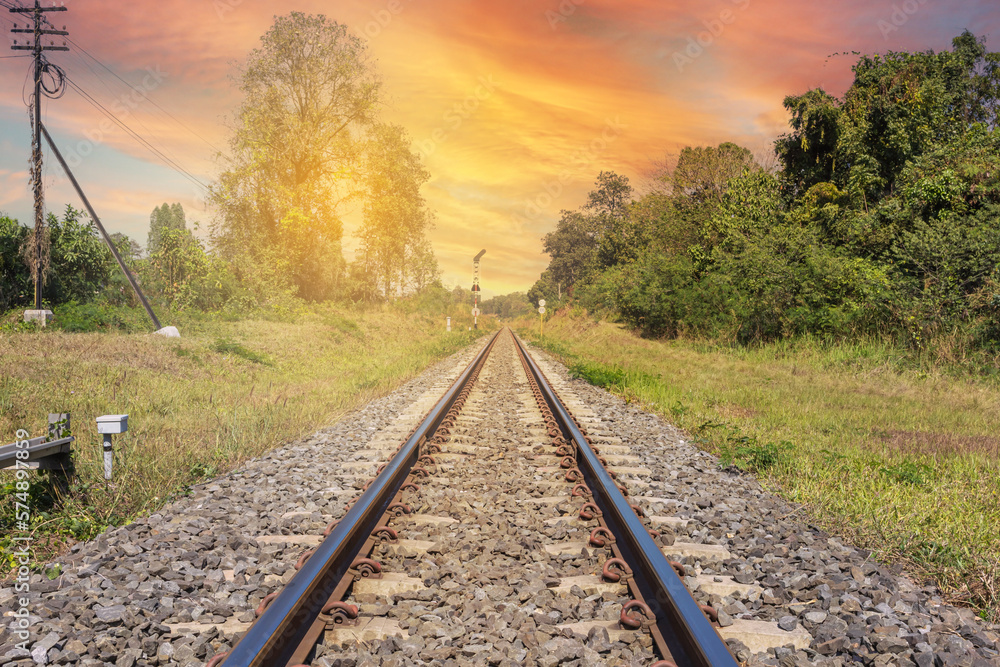 Railway tracks against beautiful colorful sky at sunset.