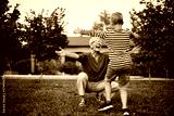 Happy senior woman greeting her son with arms outstretched in backyard.