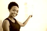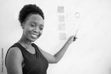 Attractive Black woman gives presentation at work points to chart on wall
