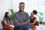 Portrait of a smiling Black businessman with arms folded, boardroom colleagues